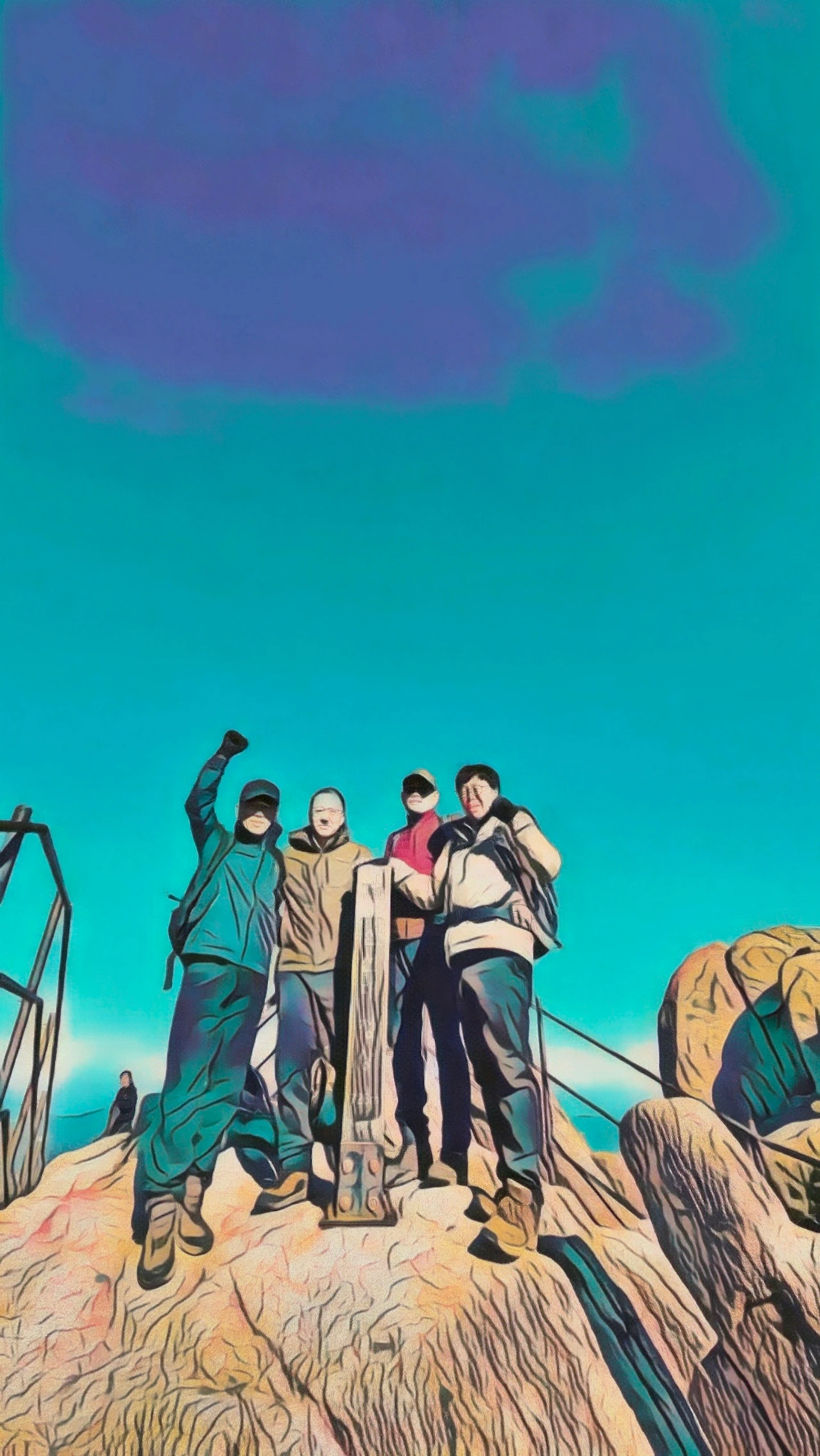 자운봉 아래 너럭바위 위에 둘러앉아 H가 올라오기를 기다리며 배낭을 열어 허기를 달랬다. 이십여 분 후에 송추폭포 쪽에서 급히 올라온 H와 이산가족 상봉하듯 반갑게 합류했다. 자세한 진료결과는 기다려 봐야 나온다지만, 몸에 큰 문제는 없는 듯해서 다들 안도했다. 신선대에 올라 함께 인증 숏을 남기며 북한산과 도봉산을 비롯한 주변 여러 산들이 펼친 장쾌한 파노라마를 한참 동안 조망했다.