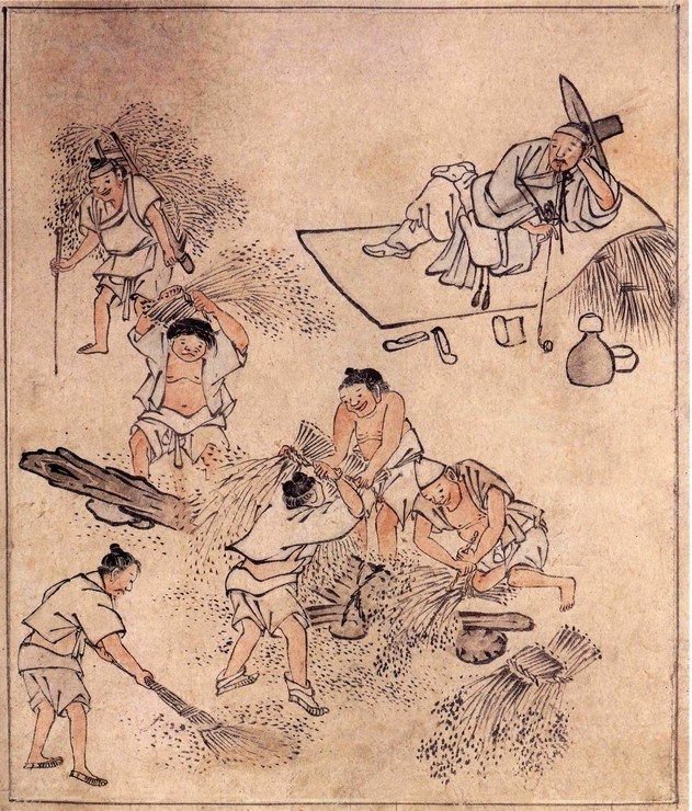 이러한 사실에 생각이 미치자, 문득 김홍도의 풍속화들이 떠올랐다. 김홍도는 「타작」에서 허리를 잔뜩 굽히거나, 몸을 비틀며 일하는 농부들의 동작을 약간 과장된 선과 리듬감 있는 구도로 묘사했다. 그들의 과장된 몸짓과 익살스러운 표정은 노동의 고단함 속에 배어 있는 활력과 공동체적 유대감을 유머러스하게 드러내고 있다. 그들의 모습은 장죽을 물고 비스듬히 누워있는 양반의 모습과 대비되는데, 이는 당시 신분에 따라 사회적 역할이 갈리는 계급사회의 일면을 극명히 보여주고 있다.