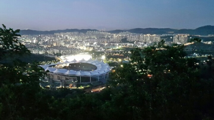 봉우리들은 모두 해발 1~2백여 미터로 나지막하지만 갈마산으로 오르는 계단은 어둠 속에 묻혀서 끝이 보이질 않는다. 잘 자란 나무 숲 사이로 문학 월드컵 축구장이 하얀 돛대를 펼친 범선처럼 우아한 모습을 드러냈다. 몸을 돌려 방향을 바꾸면 산 아래 마을의 불빛 저 너머로 융단을 깔아놓은 듯 신비롭게 빛나는 송도 신도시 빌딩 숲과 인천대교가 황홀한 야경을 선사한다.