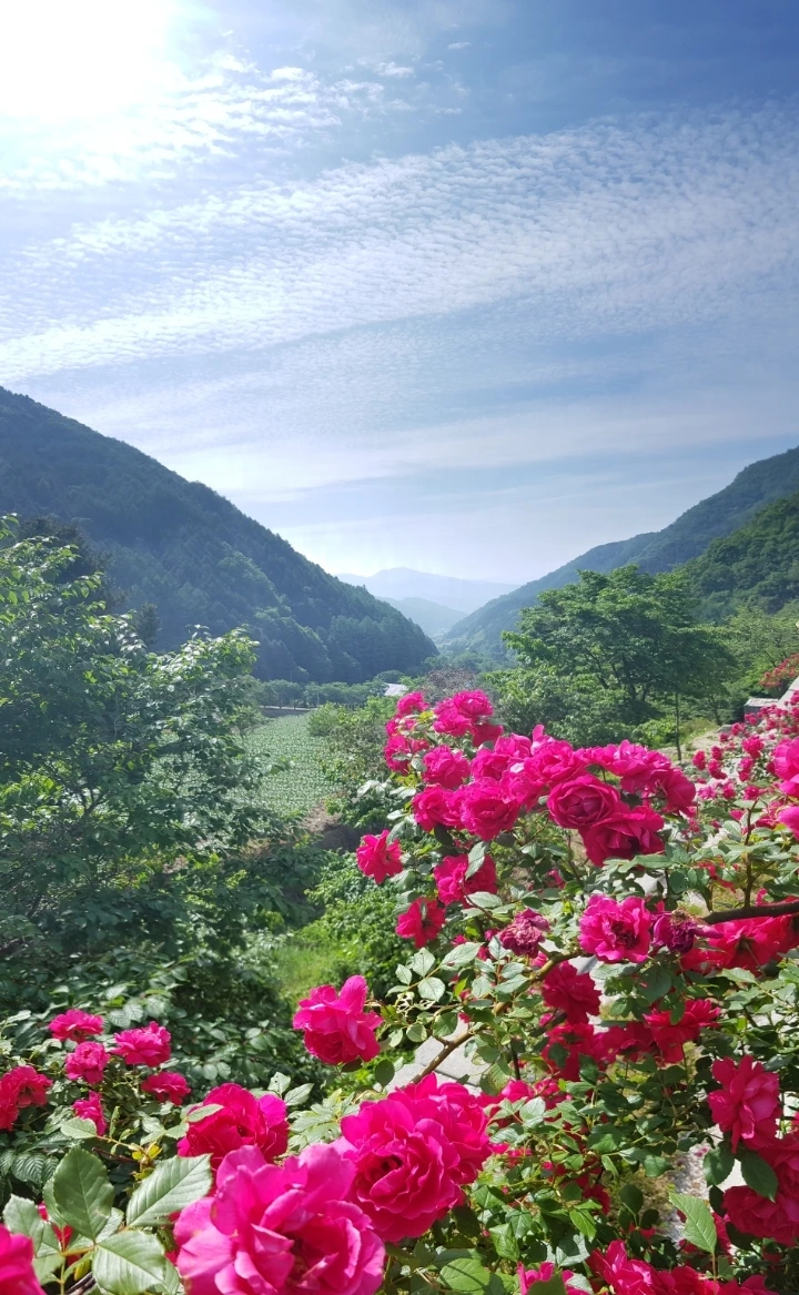 만발한 장미꽃이 기대어 선 주차장 난간 너머 지나온 계곡 쪽 하늘은 양털 구름을 펼쳐놓았다. 절로 탄성을 자아내게 하고 몸과 마음을 깨끗이 정화해 주는 그 누구도 흉내 낼 수 없는 순수 자연의 매력이 산과 들, 강과 바다를 찾는 이유가 아닐까.