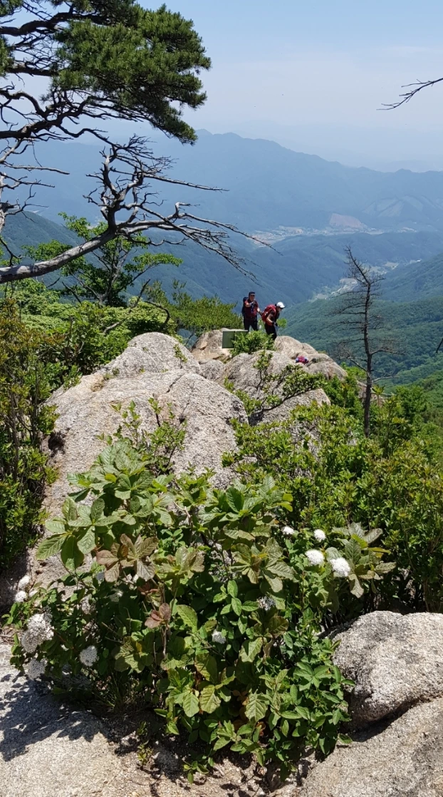 평탄하던 능선 숲길 앞을 갑자기 사막의 피라미드처럼 거대한 암봉이 우뚝 막아선다. 정상 아래 샘터와 제1봉, 그리고 2,3봉의 방향을 알리는 이정표를 지나 제1봉으로 난 암벽을 오른다. 암벽길 중간에서 발을 멈추고 숨을 몰아쉬며 뒤를 돌아본다. 연초록빛 수풀로 덮인 완만하고 시원스러운 능선과 그 정점 944m 봉 위의 기상관측소가 자연과 인공의 절묘한 조화를 연출하고 있다.