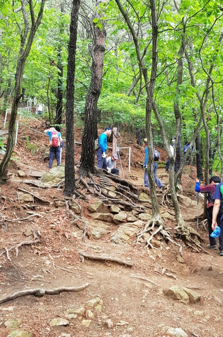 평탄한 능선을 지나 이어지는 나무 계단 길은 어른 셋이 나란히 서서 걸을 수 있을만치 너르다. '십 년이면 강산도 변한다.'는 속담은 옛말이고 요즘은 하루가 다르게 아파트 단지나 주택들이 산 밑자락으로 파고든다. 늘어난 인근 주민들이 휴식을 찾아 밀려들어 좁은 옛길이 버텨내기가 힘겨웠을 것이다.