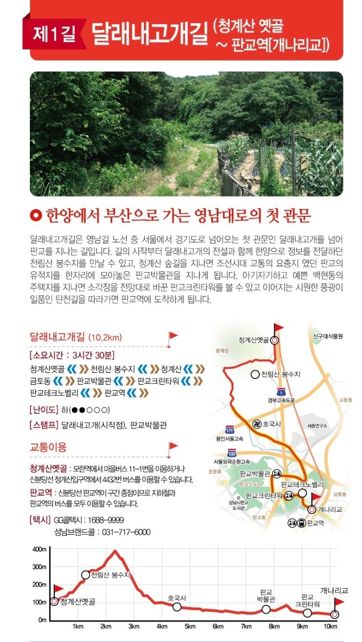 옛골 마을에 내려 영남길 제1구간 '달래내 고갯길'의 출발점에 섰다. 성남시 수정구 상적동 옛골마을과 금토동을 지나는 고개로 오누이에 얽힌 슬픈 설화가 전해오는 달래내 고개는 경부고속도로가 지나면서 서울과 성남의 경계가 되었다.