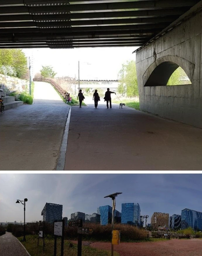 머리 위로 경부고속도로, 제2경인고속도로, 외곽순환도로가 교차하는 판교 IC 밑 금토천을 따라 걷는 길은 내달리는 차량 소음으로 귀가 따갑다. 교각이 늘어선 다리 밑을 지나서 반듯하고 세련된 고층 건물들이 늘어선 테크노밸리 빌딩 숲으로 들어섰다. 혁신을 꿈꾸는 이노밸리 빌딩 숲의 그늘 쉼터에 앉아 과일과 음료로 허기를 달랬다.