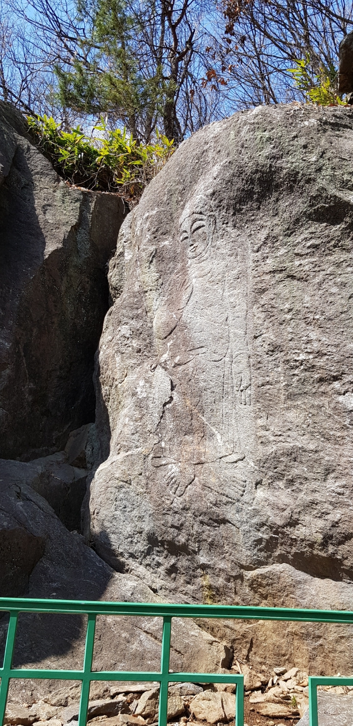 난간이 있는 가파른 나무 계단을 힘겹게 오르다 보면, 큰 바위 아래 약수터와 함께 문수사지 터로 추정되는 너른 평지가 나온다. 벤치에 앉아 숨을 고르고 발길을 재촉하니 정상 아래 커다란 바위 벽면에 마애보살 두 분이 나란히 서 계시다. 문수보살과 보현보살로 고려 전기 때 양식이라는 안내판 설명이다. 비가 오나 눈이 오나 천 년 넘는 세월을 한결같이 자리를 지켰을 두 보살을 향해 합장하고 정상으로 향한다.