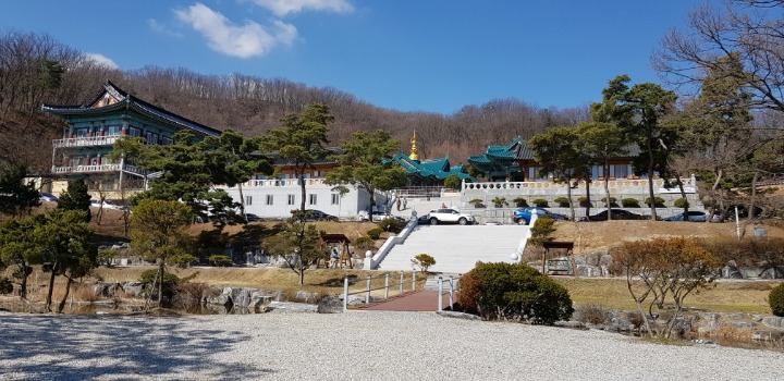 대웅전 관음전 산신각 조사전 적묵당 범종각 등이 들어선 제법 규모 있는 사찰로 템플스테이도 운영한단다. 황금빛 높은 첨탑을 가진 '아(亞)'자 형태의 대웅전과 53톤 통돌로 조성한 석가모니불이 인상적이다. 고려 때 것으로 추정되는 관음전 앞 삼층석탑은 서울 구로동 어느 가정집에 옮겨왔다고 한다.