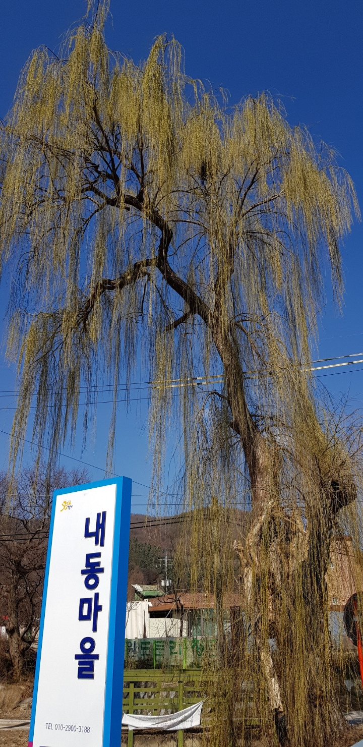 마을 표지판이 서 있는 마을 입구에 늙은 버들 한그루가 여인이 긴 머리칼을 빗질하듯 가느다란 가지를 길게 널어 뜨리고 서있다. 파릇한 연둣빛 잎사귀들이 햇빛을 받아 황금빛으로 빛나는 모습이 인상적이다.