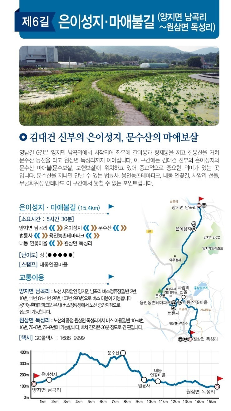 영동고속도로 양지 IC로 내려서서 은이 성지 법륜사 방향을 알리는 표지판을 스쳐 지난다. 백암에서 마을버스로 갈아타고 원삼면 독성리로 향했다. 반듯한 백암 초교 교정에 자리한 세종대왕과 신사임당 동상이 가지런하다. 독성 2리에서 덜컹대는 미니버스에서 내려 영남길 제7구간을 뒤로하고 제6구간 서울방향으로 발을 옮긴다.