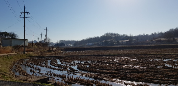 띄엄띄엄 자리한 농가들과 논밭 사이로 난 길을 지나고 낮은 언덕을 오르내리는 구릉지대가 연속된다. 얕은 산을 내려와 한적한 농가 주변을 지날 때면 어김없이 견공들이 낯선 발걸음을 경계하며 충성심을 경쟁하듯 컹컹컹 사납게 짖어 댄다.