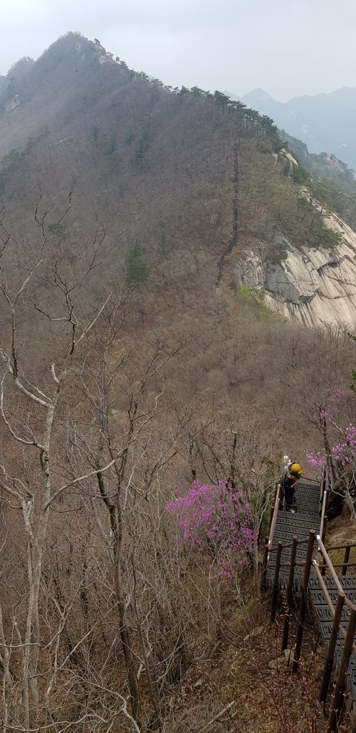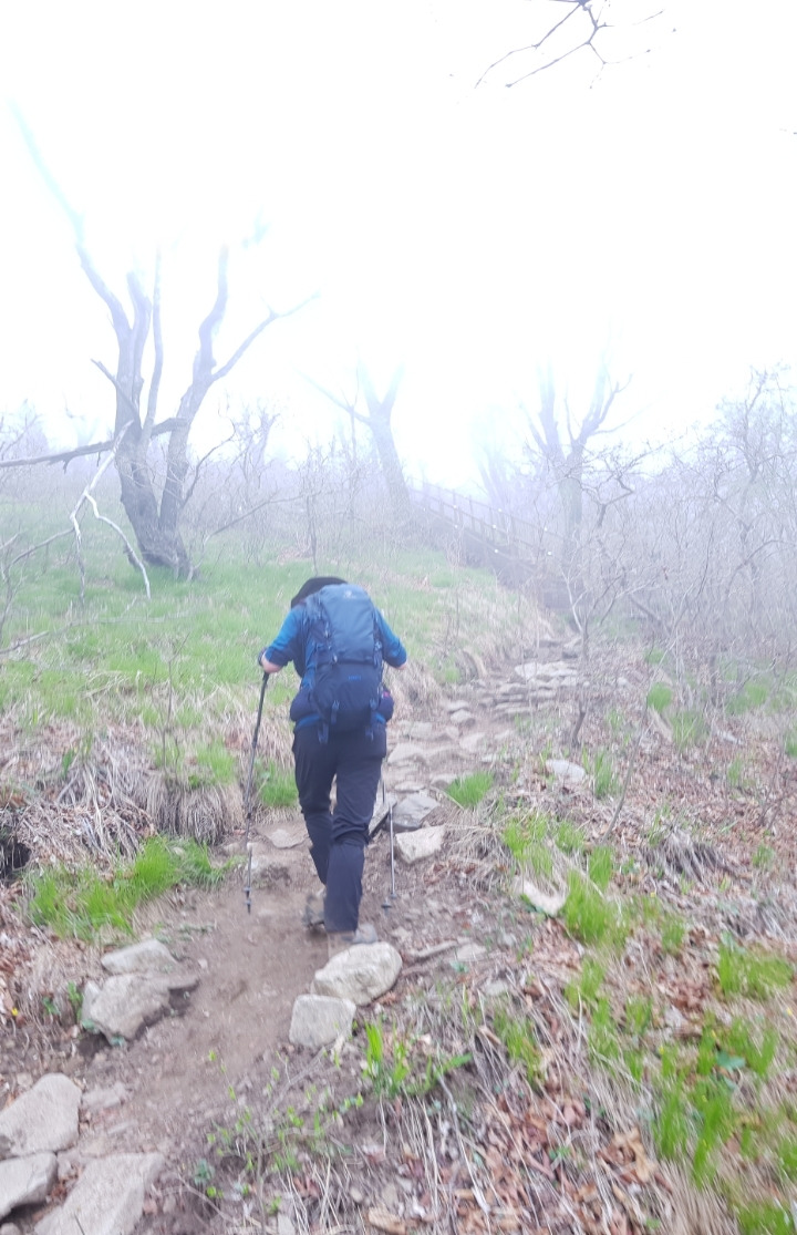 내려가고 오르는 가파른 계단 길이 반복된다. 앞쪽으로 점점 안갯속으로 희미해지는 산군이 겹겹 늘어서 있다. 거친 암릉으로 이어진 봉우리들이 우뚝 우뚝 앞을 막아선다.