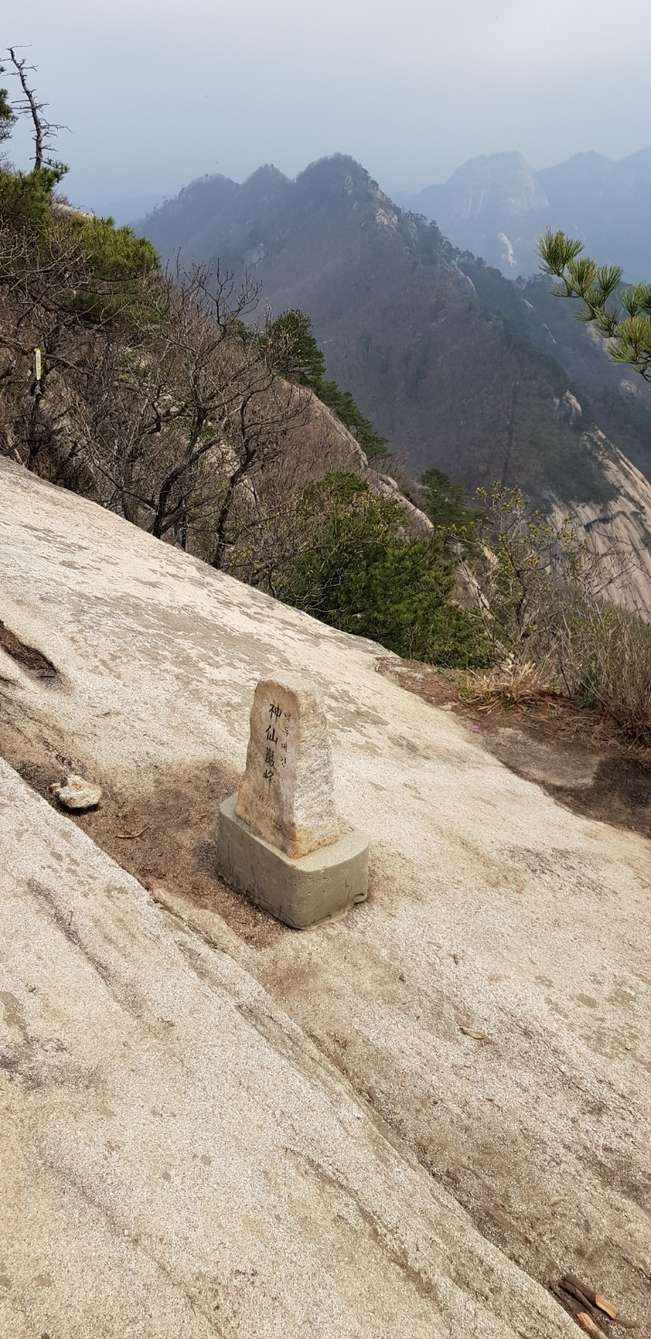 반대쪽에서 올라오는 일단의 산객을 피해 신선암봉을 뒤로했다. 신선암봉을 벗어나서부터는 계단길도 드물어지고 암벽 위 나무에 덜렁 밧줄 하나를 묶어 놓은 곳도 한 둘이 아니다. 암벽에 박아 놓은 철심을 밟고 밧줄에 의지하며 이 봉에서 저 봉으로 오르내리기를 수 차례 반복한다.