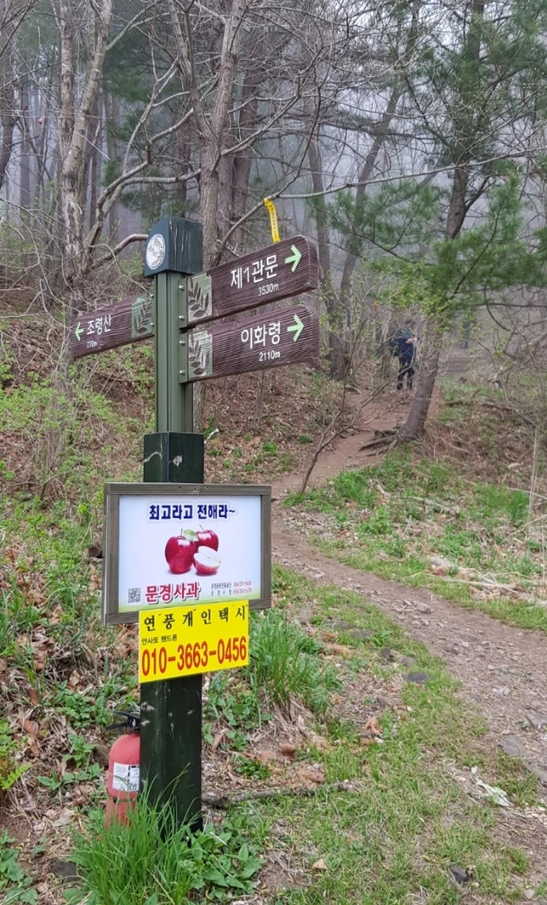 해발 550여 미터쯤 무덤 하나를 지나서 아래쪽에서 물 흐르는 소리가 시원스레 들리는가 싶더니 이내 조곡관 위쪽 해발 440m쯤 새재길로 내려섰다. 길 옆에 계곡 너머 주흘산 부봉으로 가는 길을 알리는 이정표가 서있다.