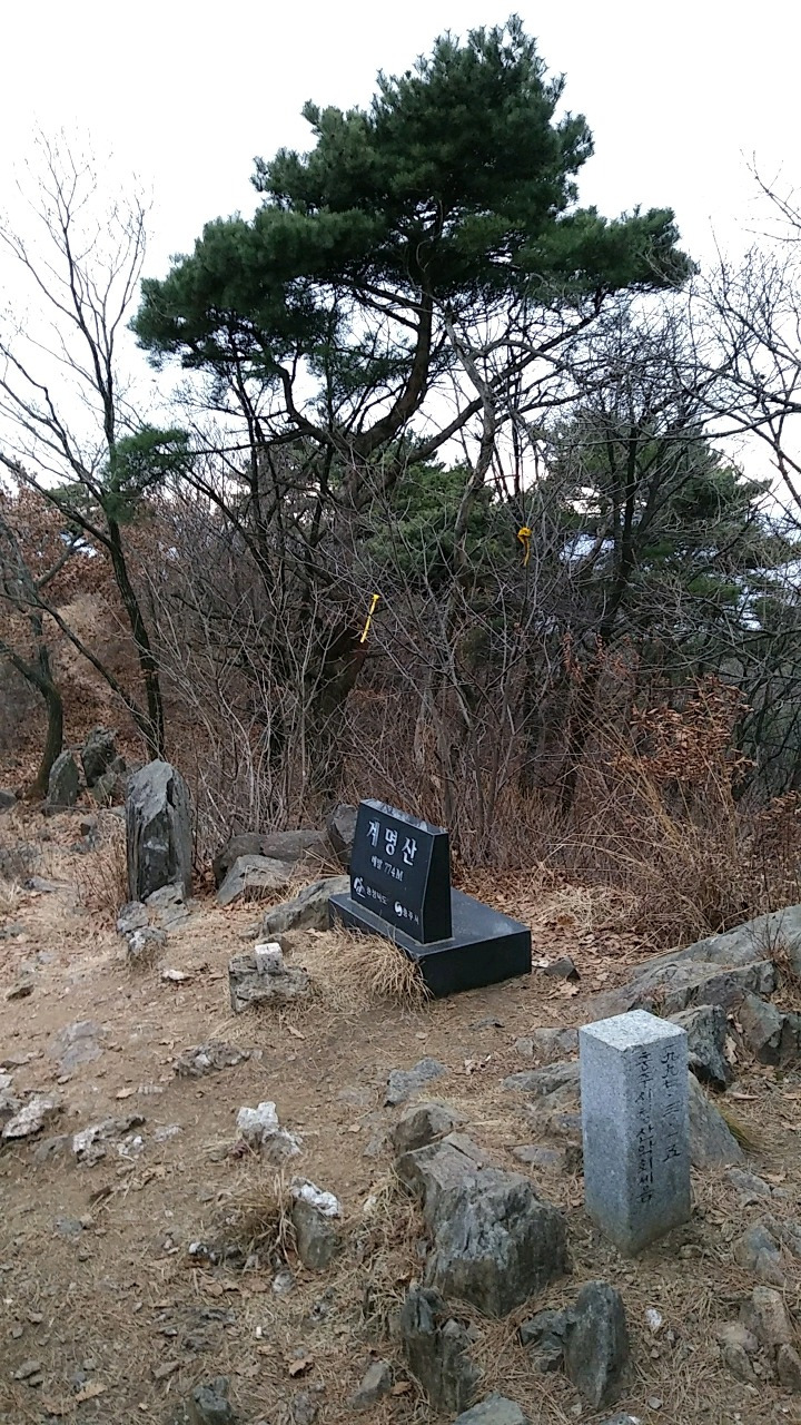두 시경 고개 삼거리 옆 텅 빈 너른 주차장에 차를 세우고 산행 채비를 한다. 계명산은 백제시대 이 산 남쪽 마고성 성주의 딸이 산기슭에서 지네에 물려 죽게 되자 산신령이 일러준 대로 닭을 산에 풀어놓아 지네를 퇴치했다고 해서 지어졌다는 얘기가 전한다.