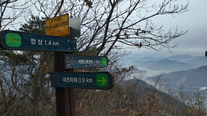 충주댐 아래쪽 남한강 위로 놓인 다리를 건너 슈퍼에서 삶은 계란 등 요깃거리를 사서 배낭에 넣었다. 슈퍼 주인장은 댐 반대쪽의 마즈막재에서 오르는 코스를 권한다. 댐에 갇힌 강물은 산줄기 사이 계곡을 채웠고 계명산 자락이 충주호와 만나는 가장자리를 따라 난 '충주호수로'는 구불구불 마즈막재로 이어진다.