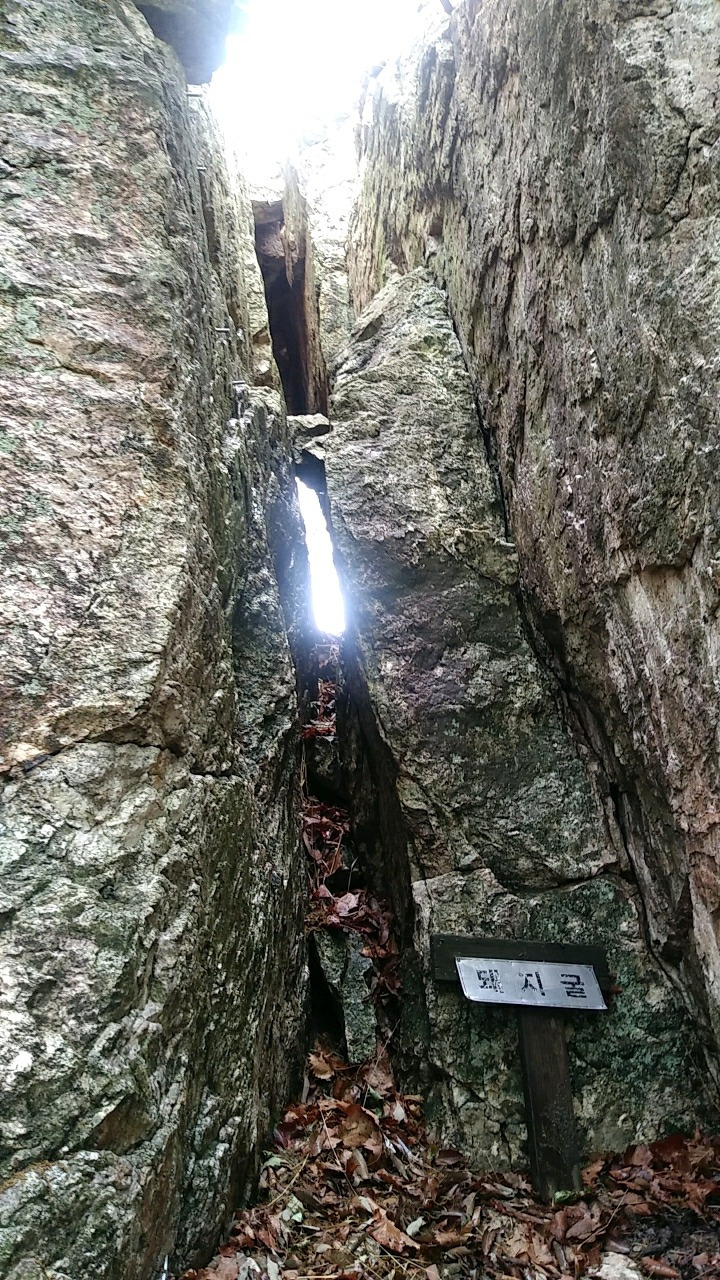 지나온 길을 되돌아 올 요량으로 정상을 스쳐지나 돼지굴 방향으로 직행한다. 능선에서 2백여 미터를 비스듬히 내려서면 오른쪽 위로 거대한 바위들이 기대어 서서 봉우리를 만들고 있다. 바위들 틈새로 밝은 빛이 쏟아져 들어온다. 위 부분에 큰 바윗돌이 덮개 마냥 끼어서 굴처럼 보이는 그 좁은 틈새, 돼지굴이다.