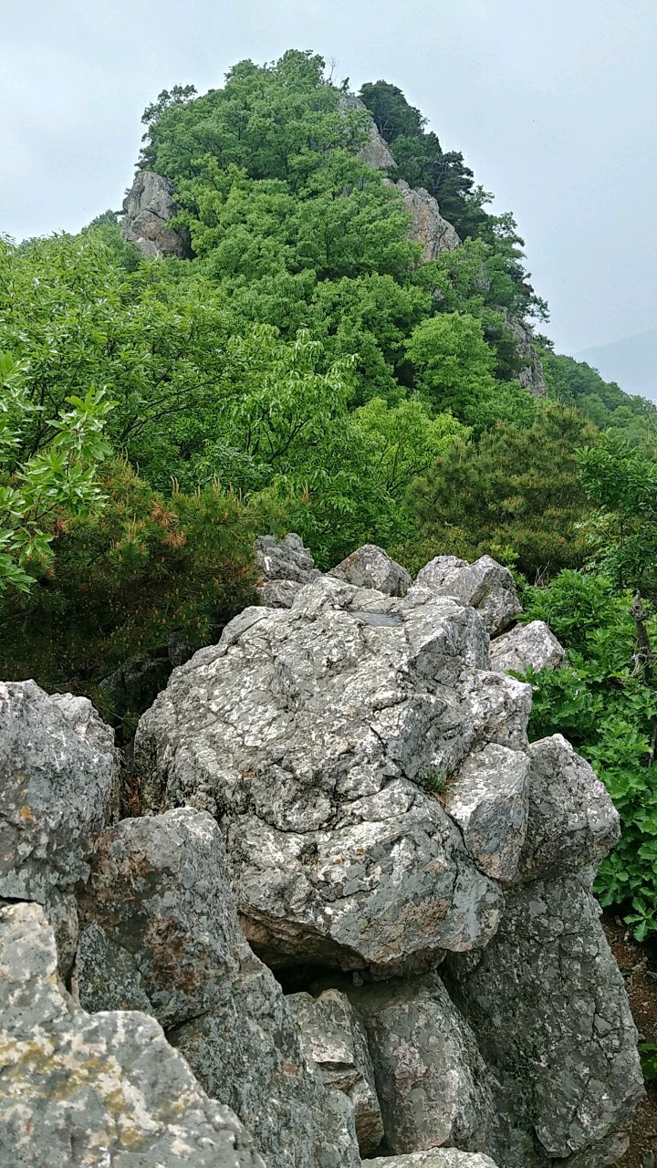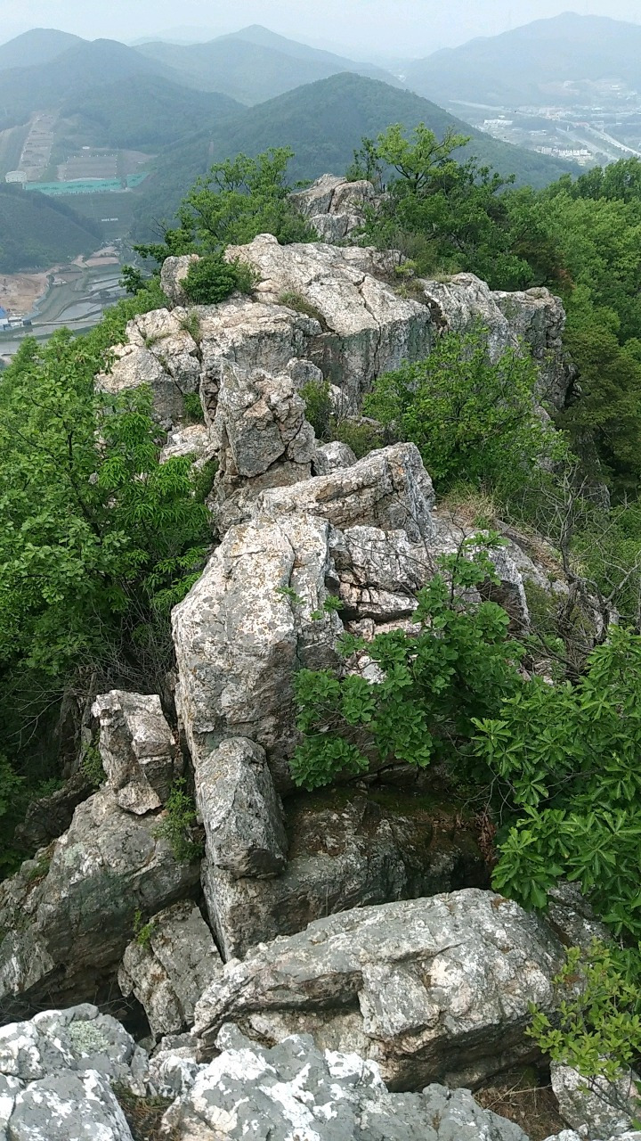제1봉은 나무에 가려 조망이 없고 멀리 도로에서 내달리는 차량 소음만 능선을 타고 올라와 귀를 거슬린다. 좌측 능선으로 발을 옮기면 고도가 조금씩 더 높아진다. 중간중간 능선 좌우로 특이한 모양새의 바위들이 비탈에 위태롭게 서서 눈길을 사로잡는다.