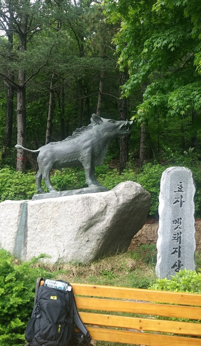 북서에서 남동으로 뻗어 있는 도드람산의 남동쪽 초입 도로 옆 들머리에는 인가가 없지만 편의점이 하나 있고 차를 세울 공간도 넉넉하다. 수분을 잔뜩 머금은 아카시아 내음이 진하게 밀려온다. 도드람산 이름 유래비와 함께 멧돼지 동상이 들머리 옆에 서있다. 머리와 꼬리를 치켜든 멧돼지는 먹이를 찾아 금방 산에서 뛰어 내려온 듯 생동감 있다.
