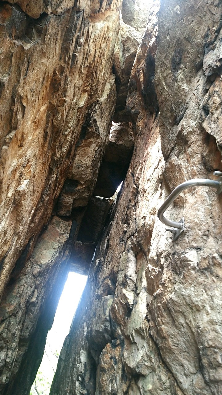 제2봉 바위로 오르는 길 바위틈에 뿌리내린 소나무에 매인 밧줄이 낡아 헤어져 위태롭다. 돼지 울음소리도 들리지 않는데... 바위봉 위에서 위 쪽을 보면 제1봉이 당장이라도 덮쳐 올 듯하고 아래쪽으로는 갈라진 바위들이 흘러내릴 듯 위태롭다.