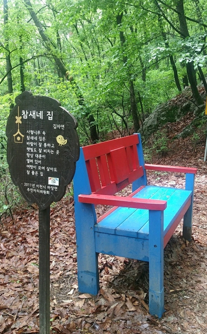 채 100미터도 오르지 않아 벤치가 놓인 쉼터가 나오고 첫 이정표가 길을 안내한다. 시원스레 큰 키의 참나무는 살랑이는 바람에 못 이겨 잎사귀에 이고 있던 빗방울을 가끔씩 흩뿌린다.