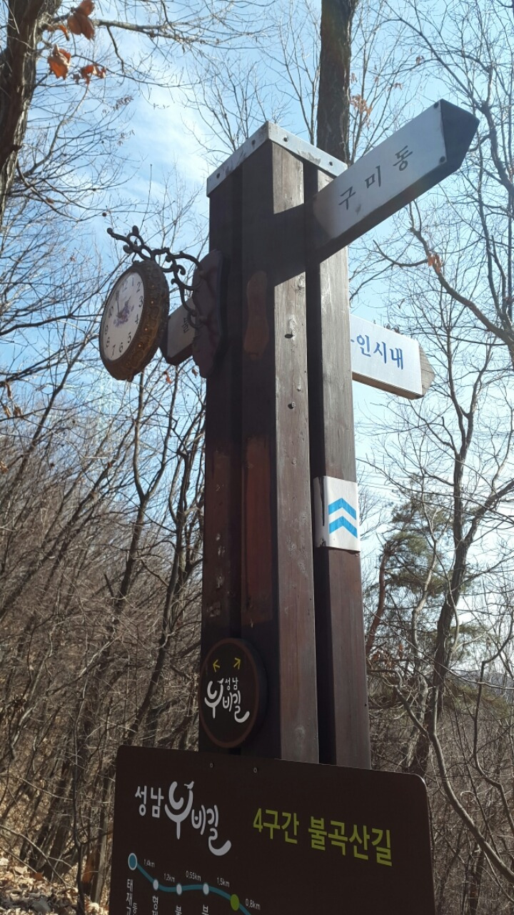 불곡산 정상으로 가는 길엔 떡봉 고개, 휘남에 고개, 부천당 고개 등이 능선을 가로질러 마을과 마을을 이어준다. 갈림길마다 이정표가 친절하게 세워져 있는데 그중 여러 곳에 둥근 벽시계를 달아놓은 것이 이채롭다.