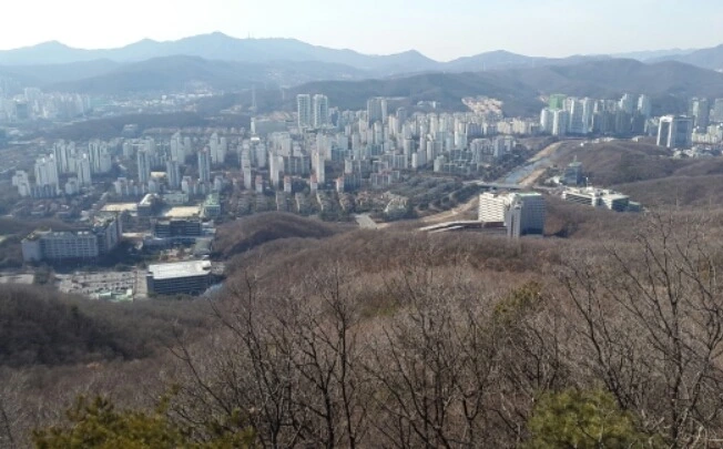들머리 불곡산 자락으로 올라섰다. 들머리에서 250여 미터를 지나 불곡산 정상 태재 영장산으로 이어지는 능선은 성남, 용인 그리고 광주를 가르는 시계를 이룬다. 들머리에서 시작된 능선은 30여 분간 양쪽에 안겨있는 마을에 들어선 높고 낮은 아파트의 허리나 옥상 높이로 난 평탄한 길이다.