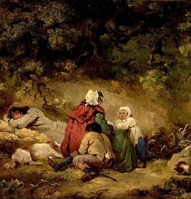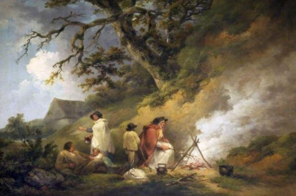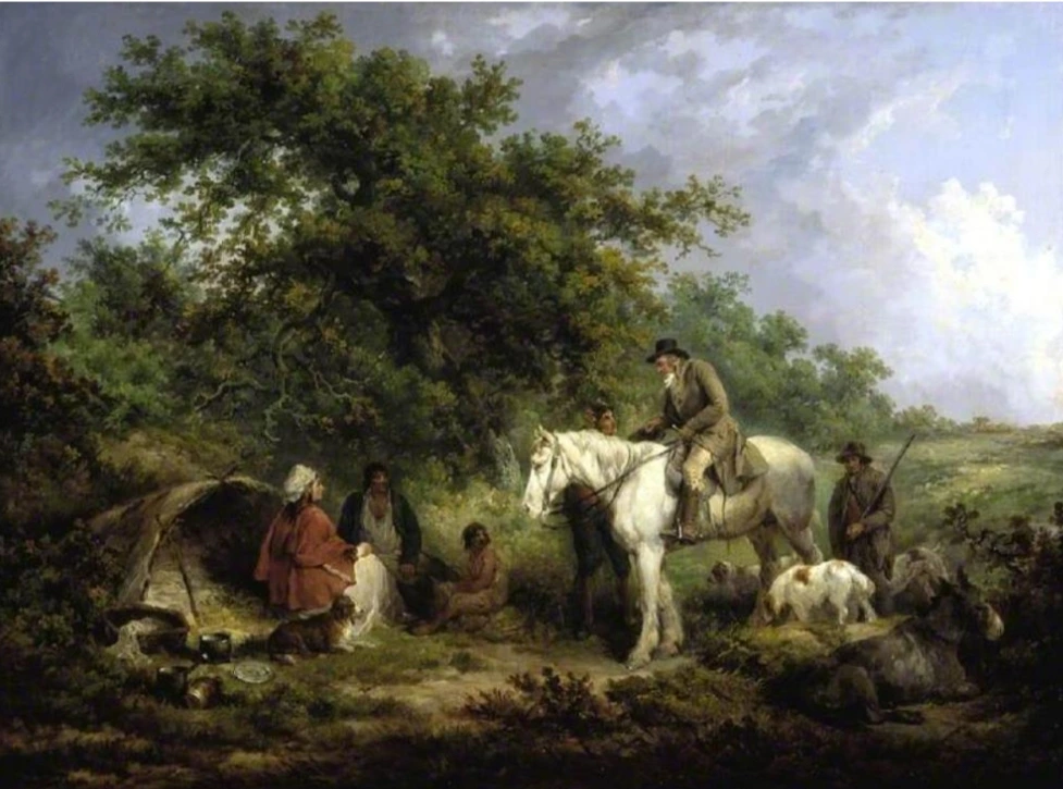 그렇다면 화가들은 어떠했을까? 그들은 집시를 어떤 시선에서 바라보았을까? 영국의 화가 조지 몰랜드(George Morland, 1763-1804)는 당시 집시의 모습을 그리는 것이 흔하게 통용되지는 않았던 시대 속에서 집시의 모습을 가장 많이 그린 화가이다.2) 특히 몰랜드의 <아침(자애로운 스포츠맨) Morning (The Benevolent Sportsman )>(1792)은 사실과는 거리가 먼 작품이다. 영국 육군 장교인 찰스 스튜어트의 업적을 기리고자 제작된 작품임에도 집시를 작품에 표현한 그의 의도는 무엇일까?