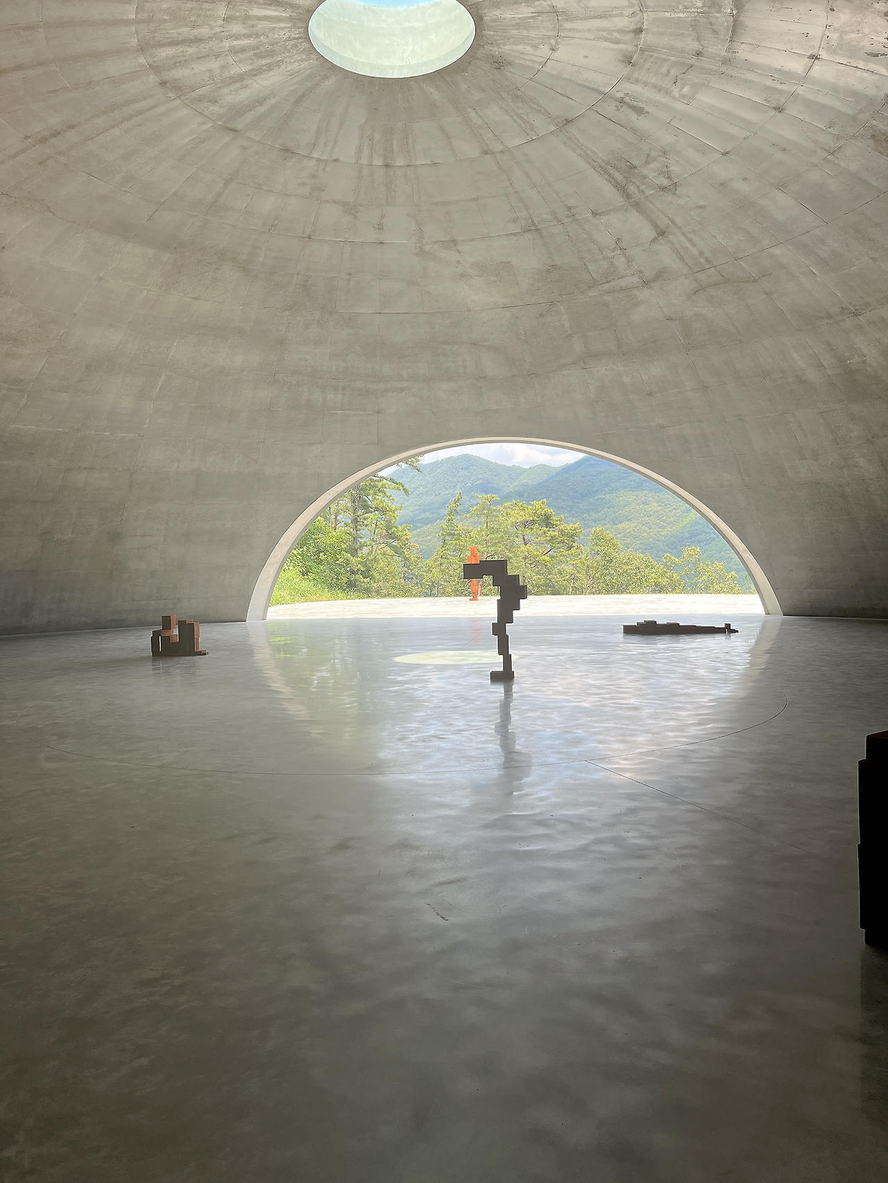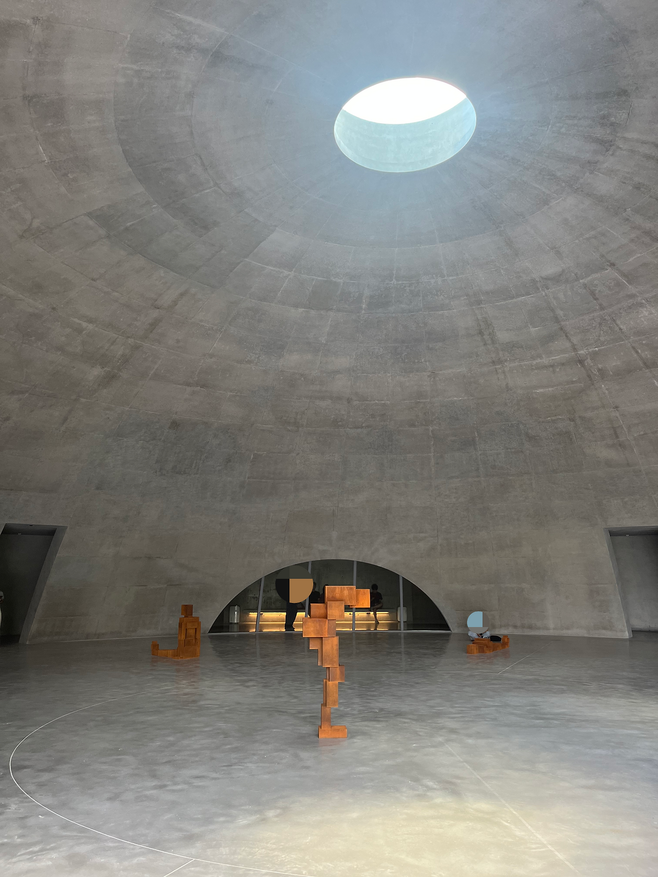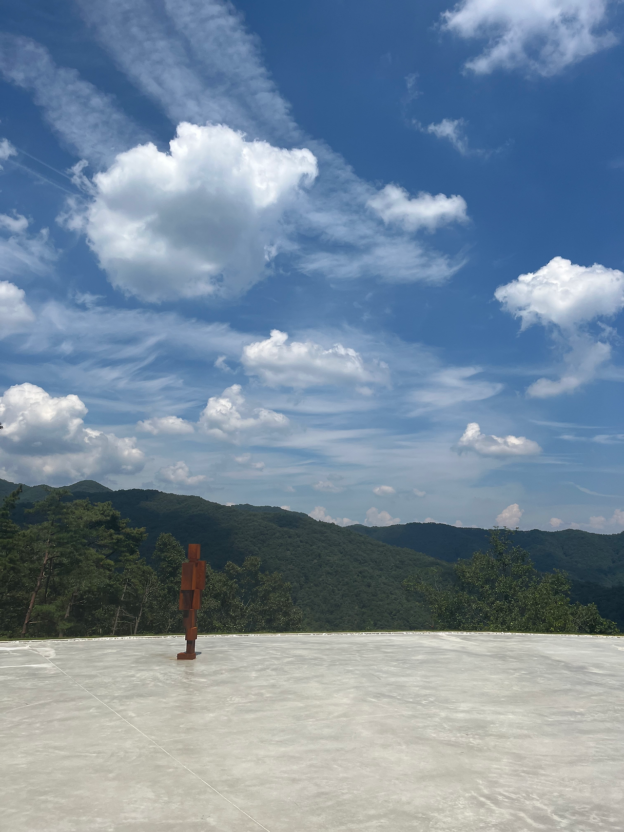 현재 뮤지엄 산에서 진행 중인 그의 전시는 이러한 사유를 가장 직접적으로 경험할 수 있는 공간입니다. 안도 타다오(Ando Tadao, b.1941)의 건축은 ‘침묵’과 ‘여백’을 품고 있고, 그 속에 놓인 곰리의 조각들은 마치 자연의 일부처럼 서 있습니다. 높은 천고와 열린 벽면 사이, 빛과 그림자만이 존재하는 공간에서 감상자는 조각과 마주하며 묵묵히 가라앉습니다.