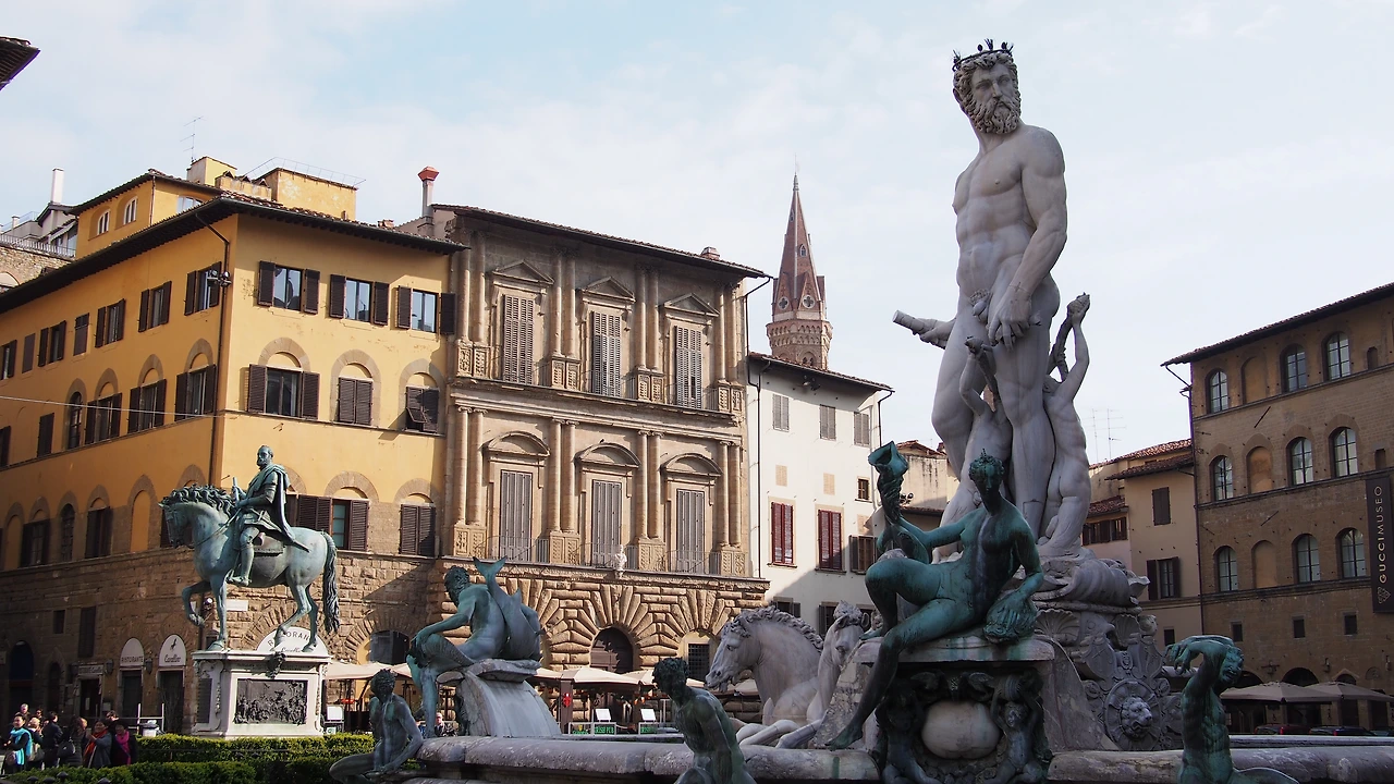 두오모 지역에서 화려하고 세련된 상점가를 지나 남쪽으로 걷다 보면 넓은 시뇨리아 광장을 만날 수 있습니다. 시뇨리아 광장은 지난 수 세기 동안 도시의 중심이 되었던 곳이랍니다. 시민들에게 인기 있는 산책 코스이자 중요한 사건이 벌어지는 날이면 어김없이 시민들이 모여 토론을 벌였던 곳이지요. 시뇨리아 광장에서 가장 눈에 띄는 것은 수십 개의 조각상이에요. 미켈란젤로의 작품인 〈다비드〉 상과 피렌체 시민들이 ‘흰 거인’으로 부르는 〈넵투누스〉 분수, 도나텔로의 작품 〈사자〉 상, 잠볼로냐의 작품 〈사빈 여인의 강간〉, 첼리니의 작품 〈페르세우스〉 등 르네상스 미술을 대표하는 여러 조각상들을 만날 수 있습니다. 시뇨리아 광장은 누구나 편안하게 르네상스 예술품을 감상할 수 있는 야외 전시장이라고 할 수 있답니다.