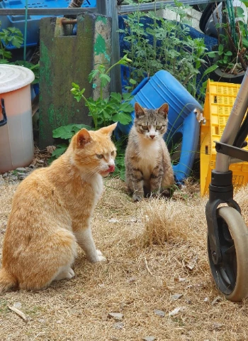 그리고는 태어나서 한 번도 만나보지 못했던 녀석들과 친해져 보려고 노력했다. 사실 기대도 하지 않았는데 어어? 한 마리가 다가오기 시작했다. 이름도 없이 통으로 노랑이라 불리는 아이들 중 사진의 왼쪽 아이였다. 오른쪽 아이보다 조금 크기가 작으니 작은노랑이다.