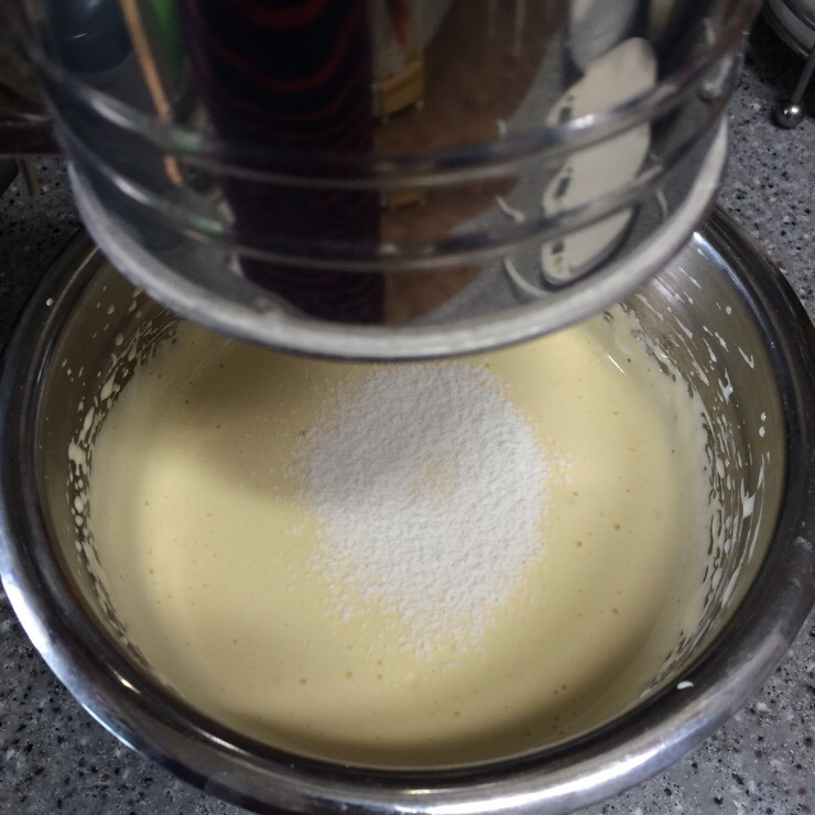 5. 밀가루를 조금씩 채쳐가며 주걱으로 섞어준다. 수 회 반복하여 (밀가루 덩어리 짐 방지)