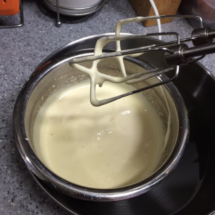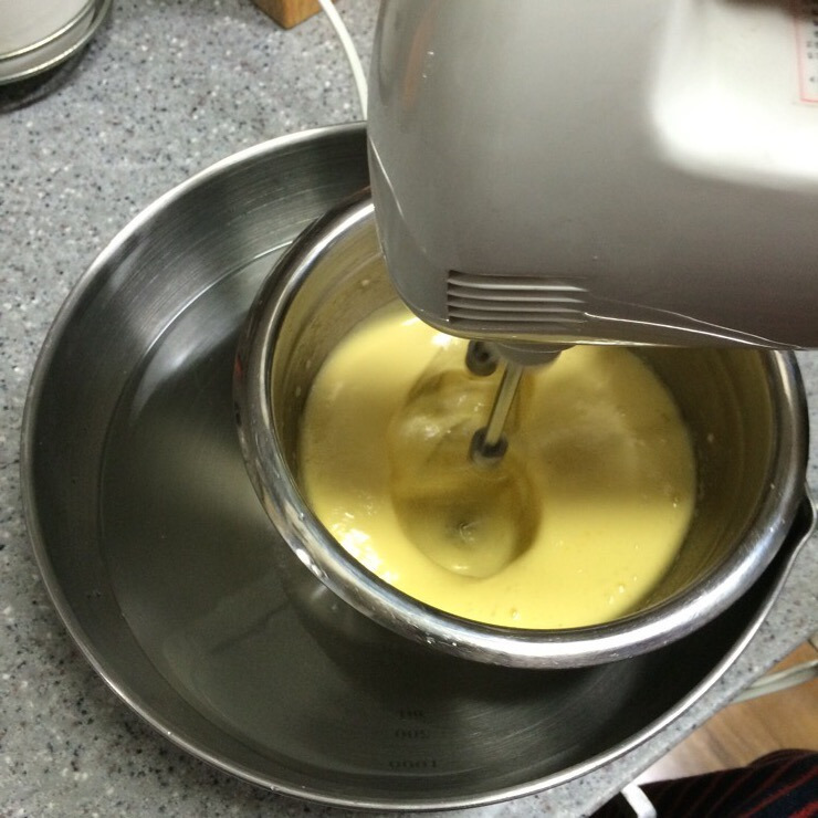 3. 중탕 보울에 반죽 보울을 넣고 믹싱. 저-중-고-저 순서로 약 4분 정도 믹싱 한다.