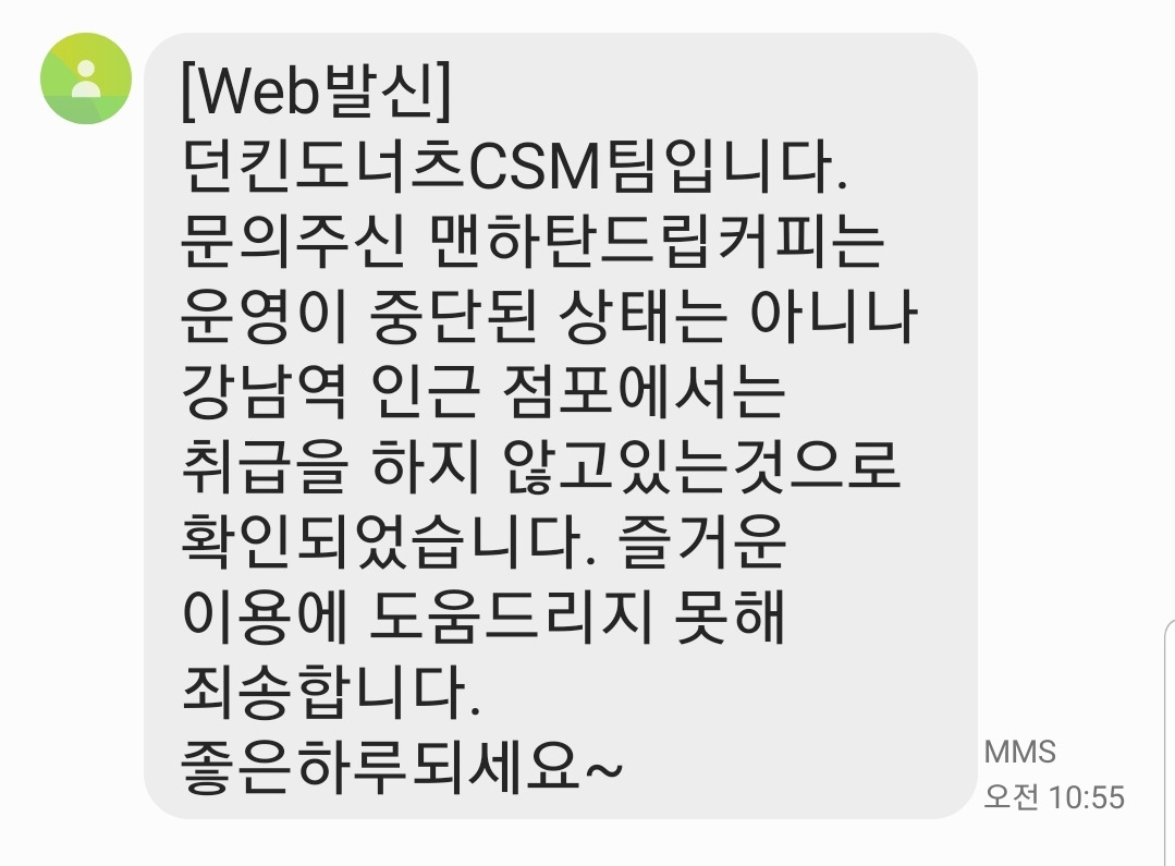 "문의하신 맨하탄드립커피는 운영이 중단된 상태는 아니나 강남역 인근 점포에서는 취급을 하지 않는 것으로 확인되었습니다."