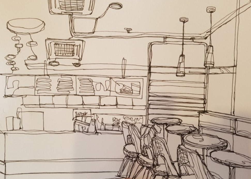 2018년 던킨 실내 모습을 컨투어 드로잉 기법으로 그려보았다. 작년 무더운 8월 이날 먹은 감귤 슬러시는 의외로 맛이 좋아 기억에 남는 날이다.