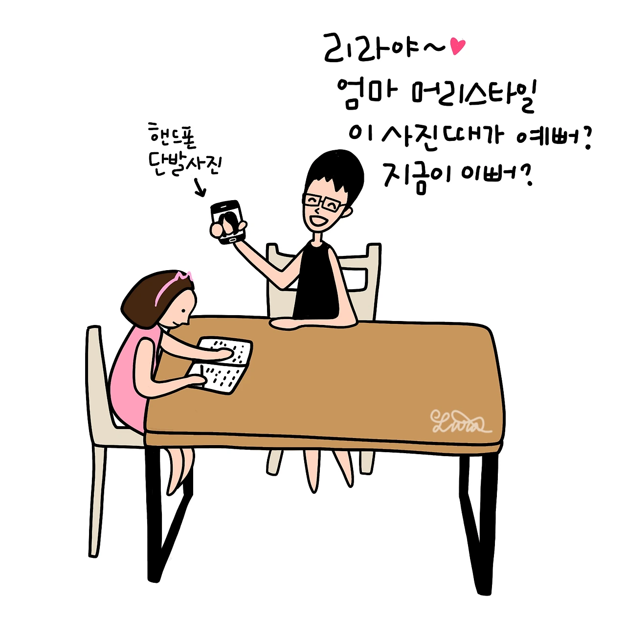나: 리라야~이사진 봐봐~ 엄마 이렇게 머리 좀 긴 스타일이 예뻐? 지금이 예뻐?