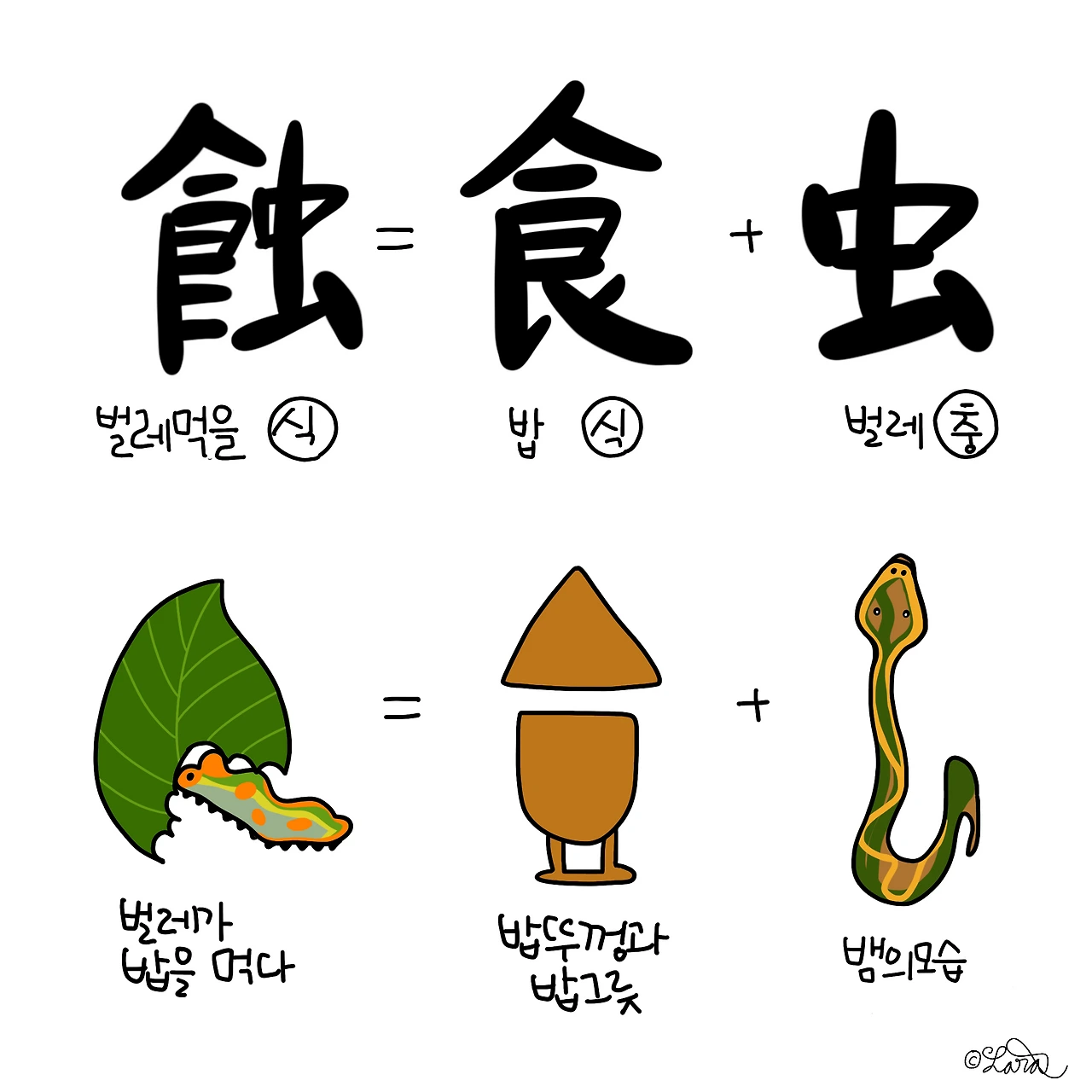 나: 하하! 잘 생각해냈어~비슷해~!식(蝕)은 '벌레먹을 식'이야. 밥 식자(食)에 벌레충(虫)이 합쳐진 글자야~