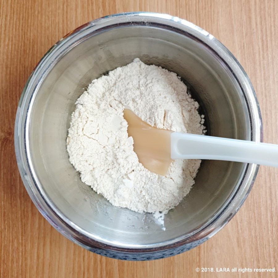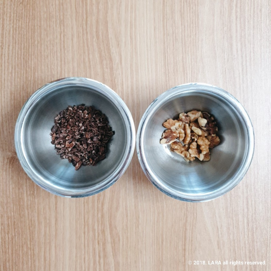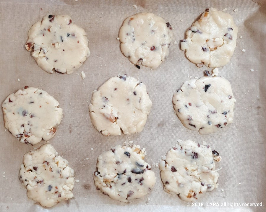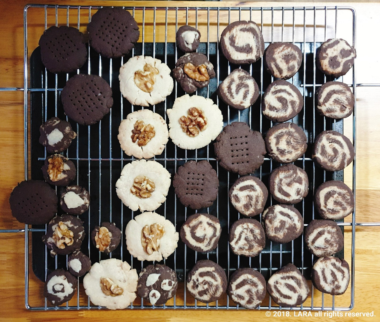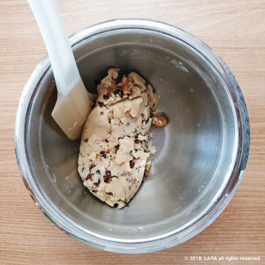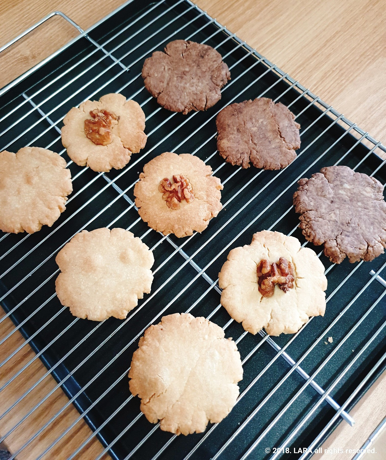 (왼쪽) 견과 없이 통밀가루만으로 만들었다. 맛이 담백하다. (가운데) 허전해 보여서 위에 반태 호두를 박았다. 맛이 고소하다. (오른쪽) 미이 된 반죽에 코코아 파우더를 조금 넣었다. 식감이 부드럽다. 하지만 이미 된 반죽에 넣어서 색이 고루 섞이지 않았다. 코코아 파우더는 발로나를 사용했다. 생초콜릿 등에 사용되는 당이 전혀 없는 쌉쌀한 맛의 파우더다.