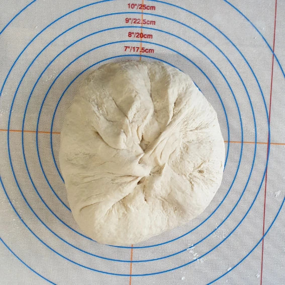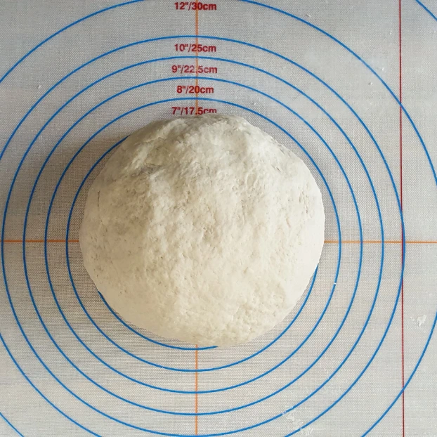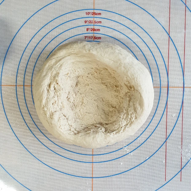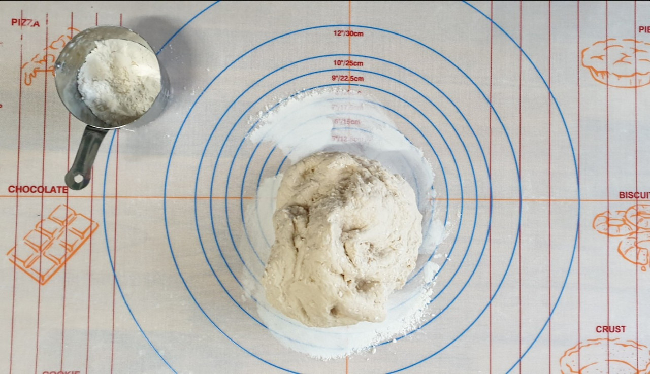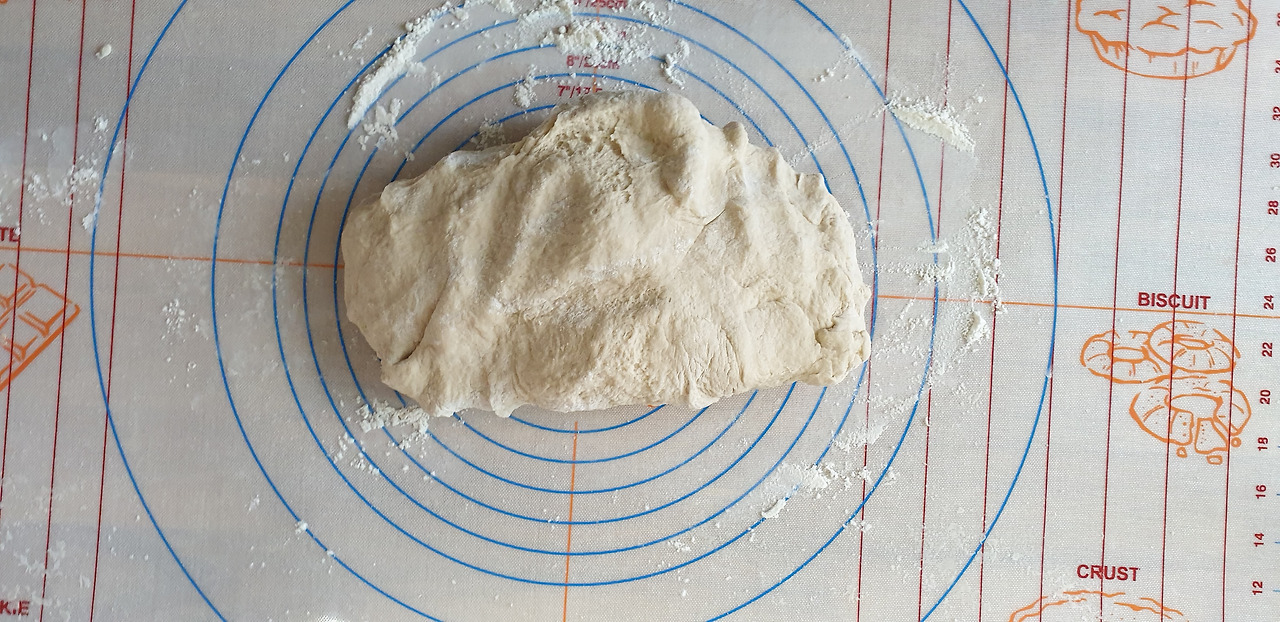 대략 덩어리가 되었다면 손반죽을 시작한다. 실리콘 매트를 깔고 매트에 달라붙지 않도록 덧가루를 뿌리고 반죽을 올린다.