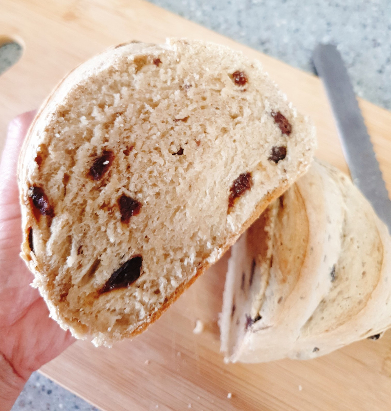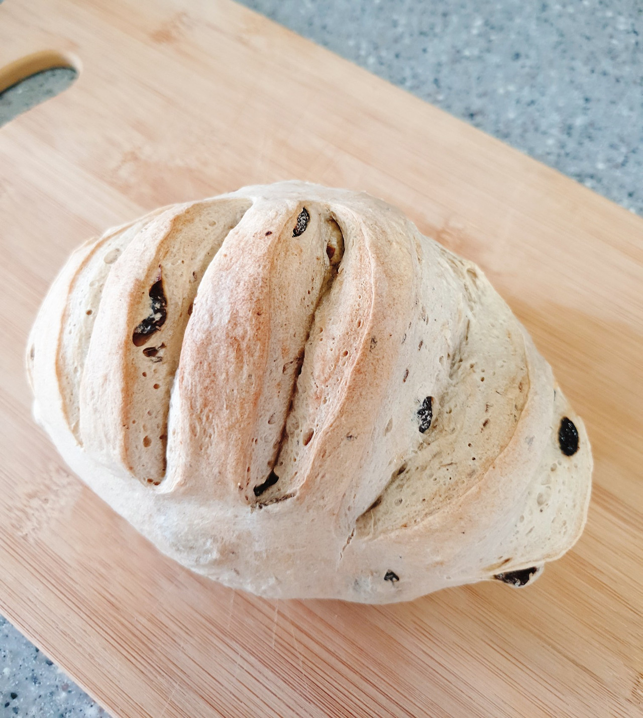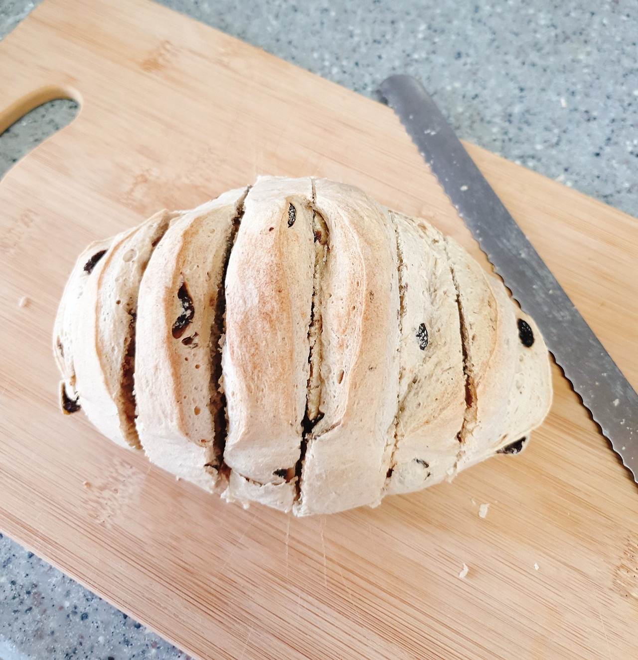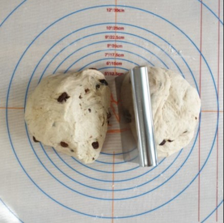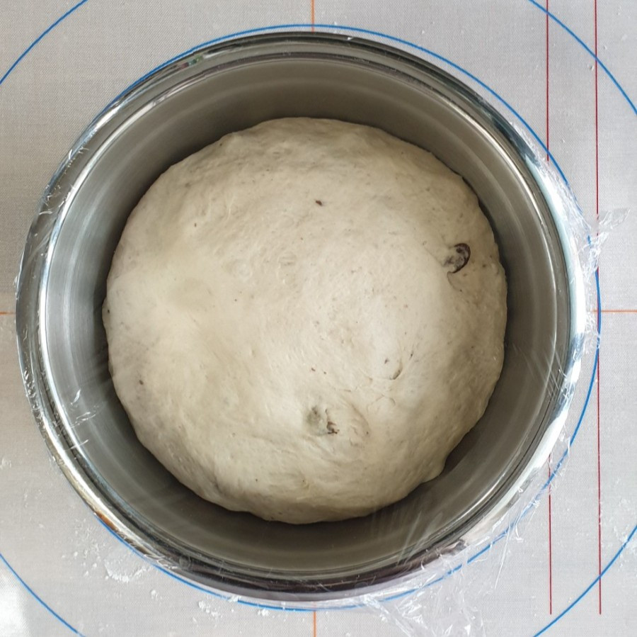2차 발효가 끝나면 반죽을 꺼내 꾹꾹 눌러서 가스를 빼고 다시 덩어리 모양을 잡아준다. 건포도가 보이지 않게 성형 후 원하는 스타일로 칼집을 넣어준다.