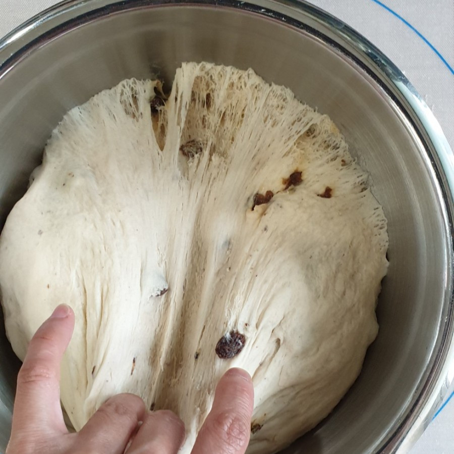 잘 여며 준 후 5분 정도 반죽한다. 건포도에서 물기가 나와서 좀 질어질 수 있으니 덧가루를 사용하여 조절한다.