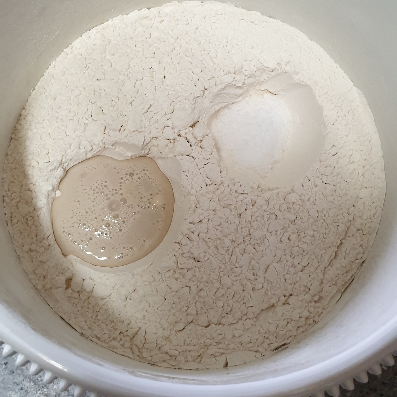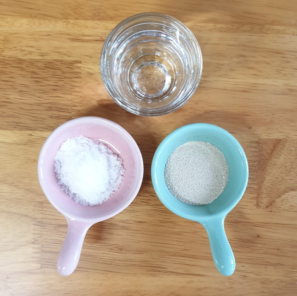 이스트를 준비해 놓은 물에 녹인다 채쳐둔 밀가루에 구멍을 2곳 내고 소금과 녹인 이스트를 넣는다 (꼭 구멍을 내고 간격을 떨어트려야 한다)