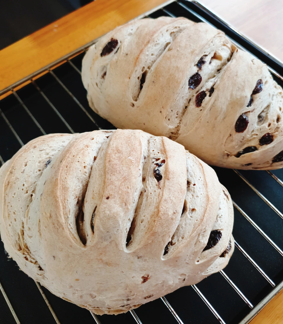 - 통밀가루 500g - 인스턴트 드라이이스트 5g - 소금 7g - 이스트 녹일 물 20ml (실온) - 반죽용 물 280ml (실온) - 건포도 80g (빼도 됨) - 덧가루용 밀가루 조금