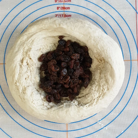 반죽에 구멍을 크게 내고 불려 둔 건포도를 넣는다.