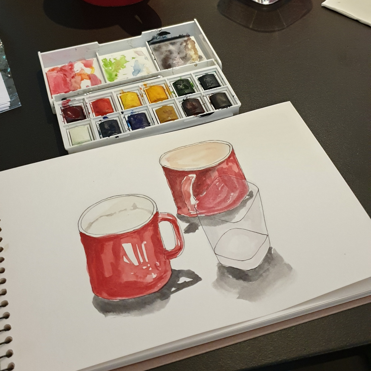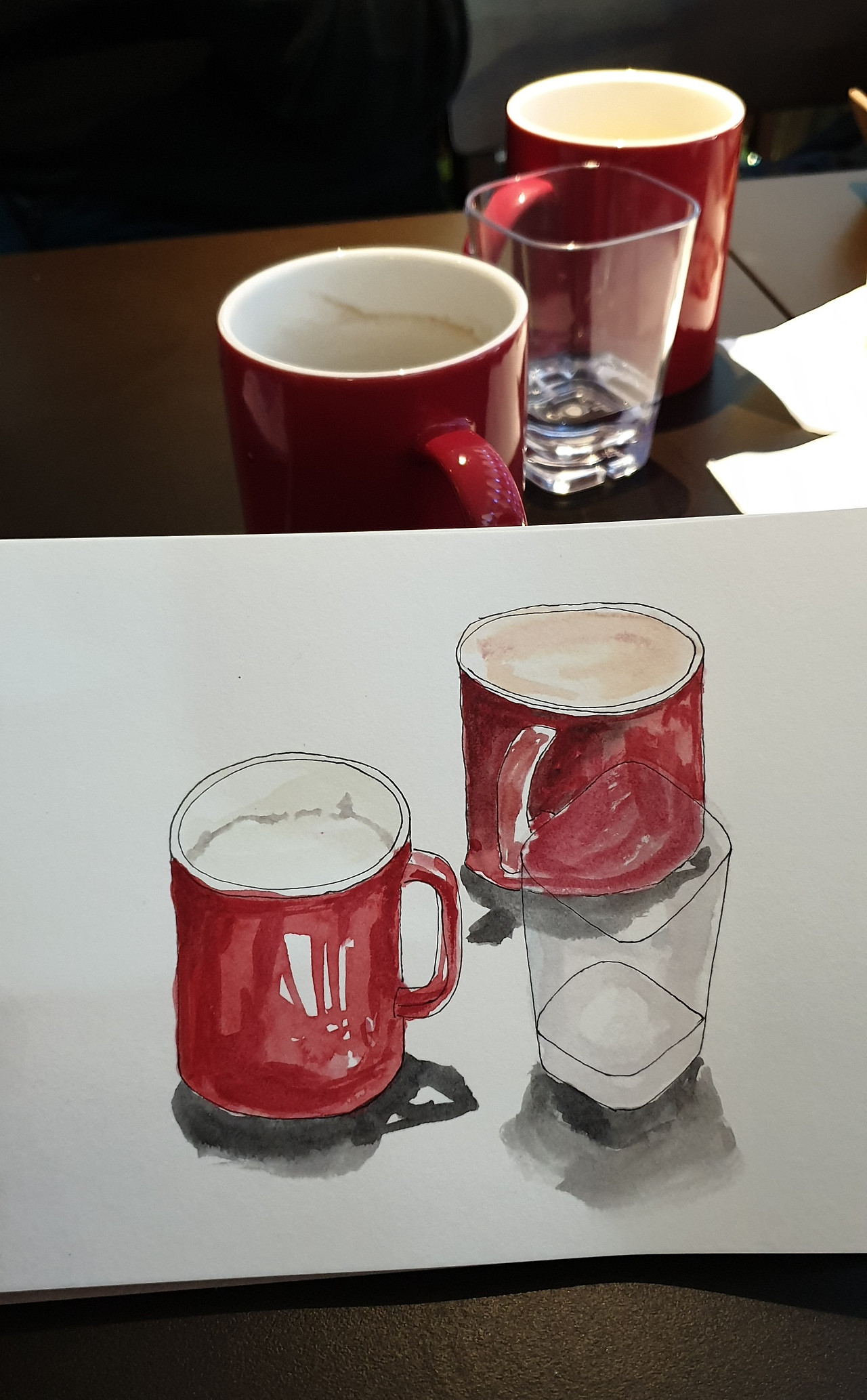 기다리는 동안 차를 마시며 드로잉 시간을 가진다