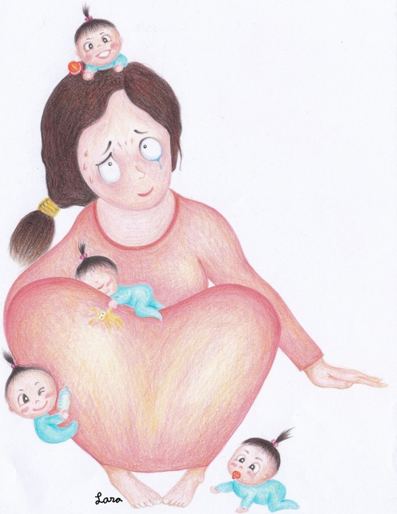 2018년 연극<임신출산대백과>를 위해 색연필로 드로잉한 작품. 육아로 지치고 힘들어 눈물 찔끔 할때도 있지만 아이의 해맑은 미소에 어느새 엄마의 입꼬리가 올라라는 모습