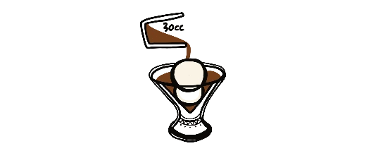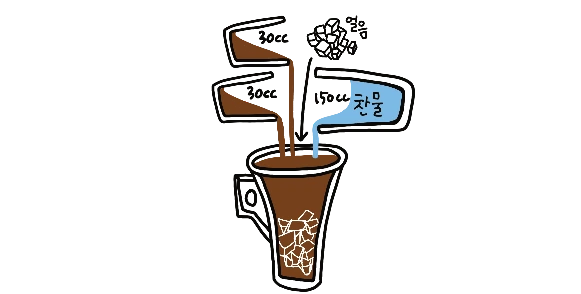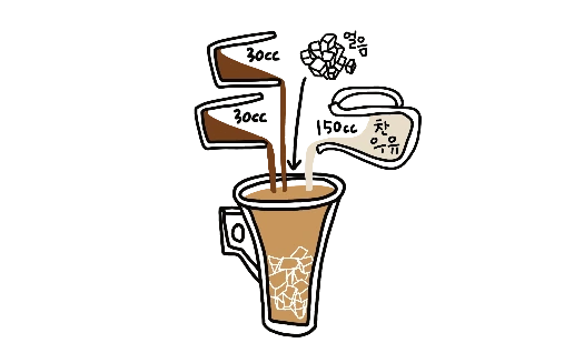 에스프레소 60cc + 찬 우유 150cc + 얼음