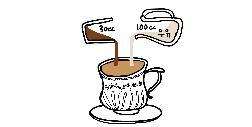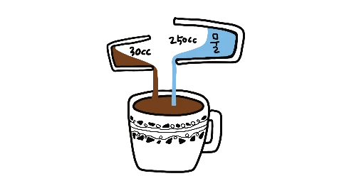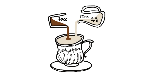 에스프레소 30cc + 우유 100cc + 캐러멜 20cc