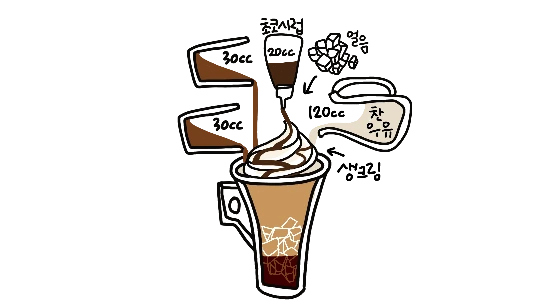 에스프레소 30cc + 우유 100cc + 초코시럽 20cc + 생크림