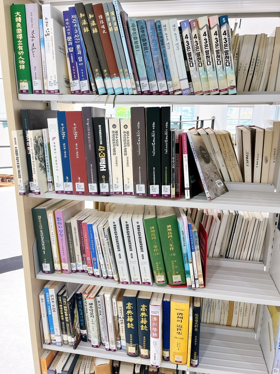 제주에서 도서관을 세 군데 방문했는데, 4월이어서 책으로 만나는 오늘의 4.3 전시는 공통적으로 로비에서 진행 중이었다. 성산일출도서관에는 제주자료 서가를 따로 구비했다. 도서관에도 제주만의 특징이 보인다.