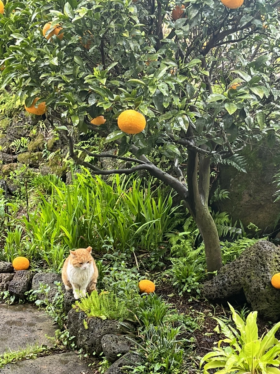 숙소에서 나오자 하귤나무 아래 귤과 털색을 맞춘 고앵이 얌전히 앉아 있다.