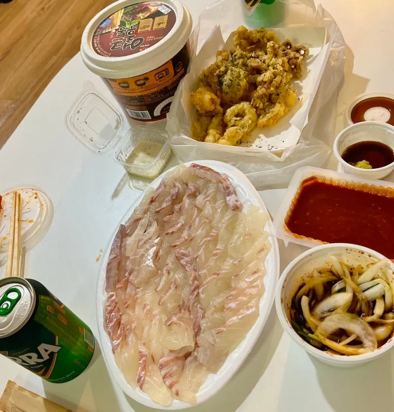 저녁은 포장해 숙소에서 드라마 보며 먹기로 했다. 숙소 근처 오션스토리의 참돔회, 출출의 오징어 튀김, 편의점표 얼큰우동과 맥주다.